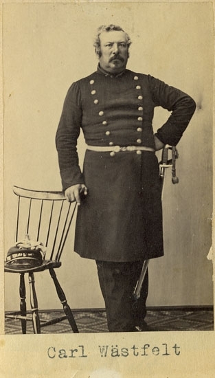Text på kortets baksida: "Kapten Carl Johan Georg Wästfält, f. 1814 d. 1864. Fullmakt 1837 Dec. 15. Kapten o Chef Fräkne comp på Backamo".