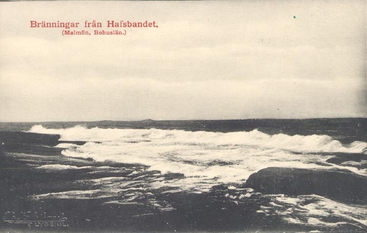Tryckt text på kortet: "Bränningar från Hafsbandet. (Malmön, Bohuslän)".