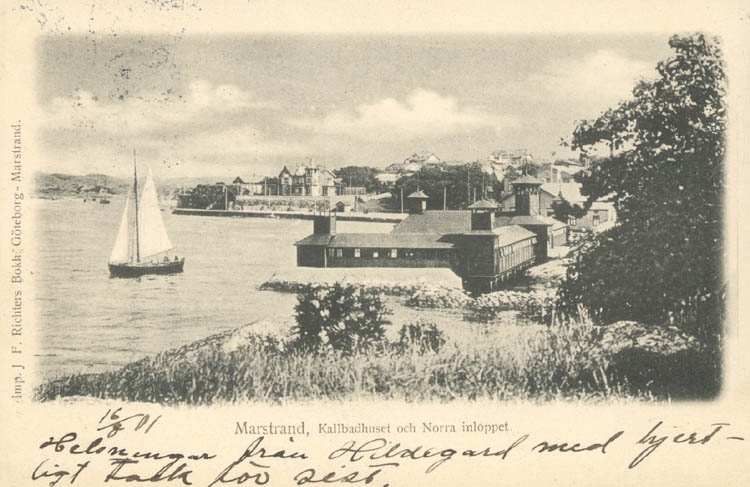 Tryckt text på kortet: "Marstrand. Kallbadhuset och Norra inloppet."