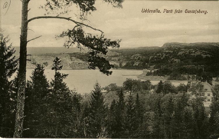 Tryckt text på vykortets framsida: "Uddevalla, Parti från Gustafsberg."