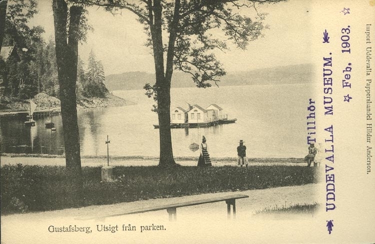 Tryckt text på vykortets framsida: "Gustafsberg, Strandpromenaden."