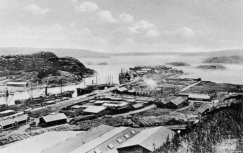 Tryckt text på kortets baksida: "Uddevalla Utsikt av Hamnen".
