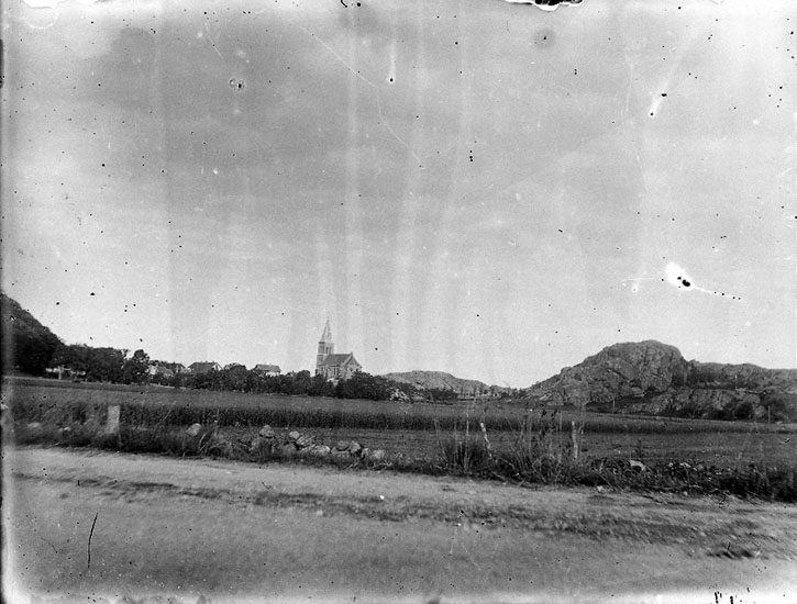 Enligt notering: "Fjällbacka kyrka å samhälle sett från Thorens verkstad".
