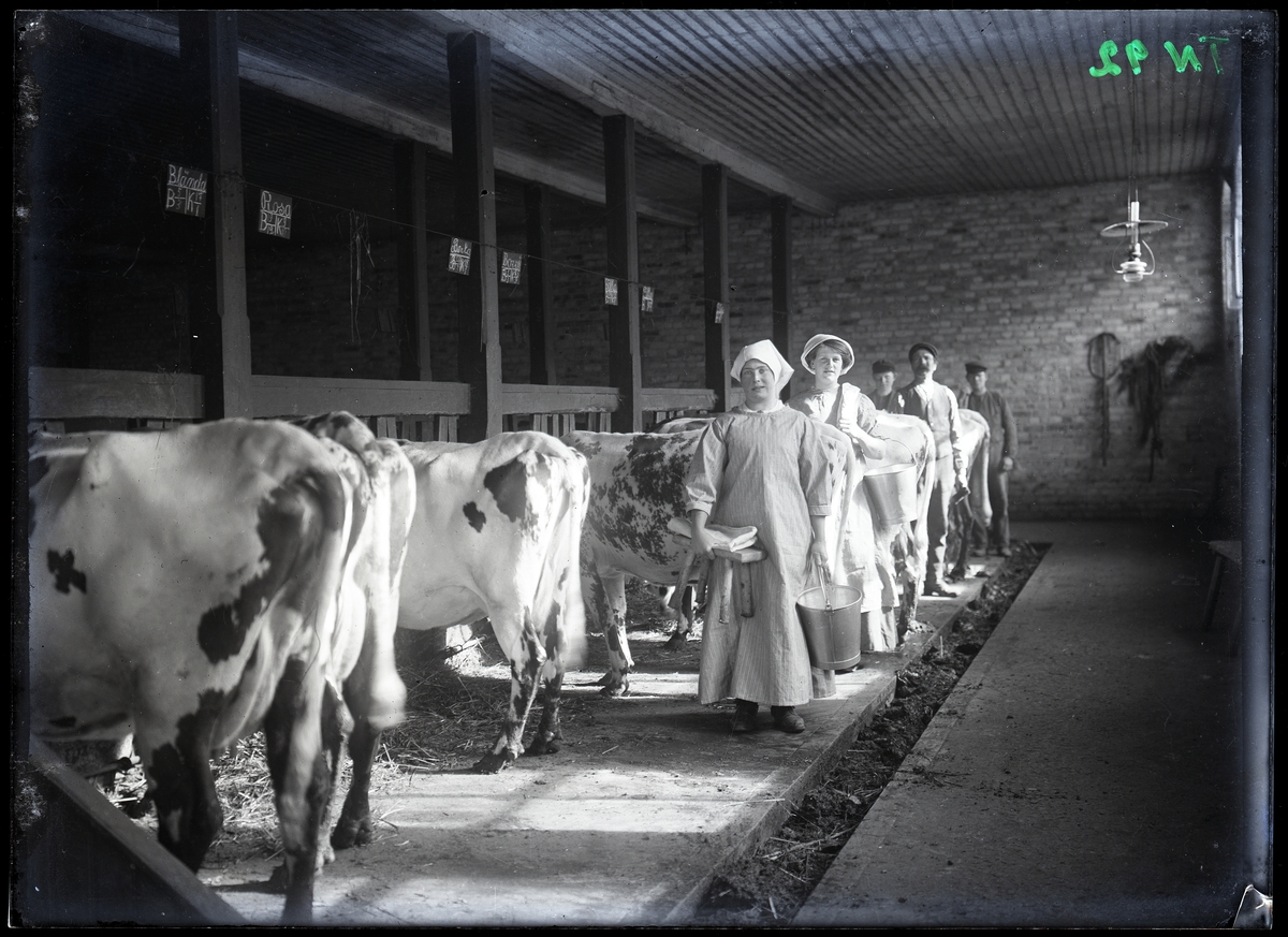 Mjölkningsdags. Interiör från ladugård med kor, två mjölkerskor och tre drängar