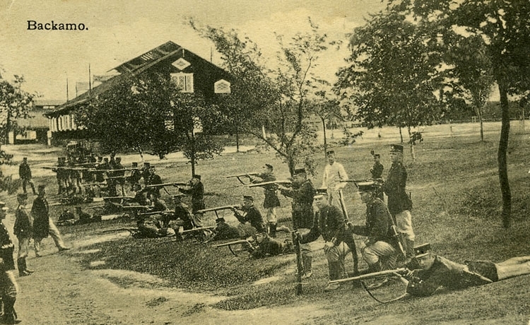 Enligt Bengt Lundins noteringar: "Gevärsexercis vid 3ans manskapsbarack. I bakgrunden gården "Bråten".