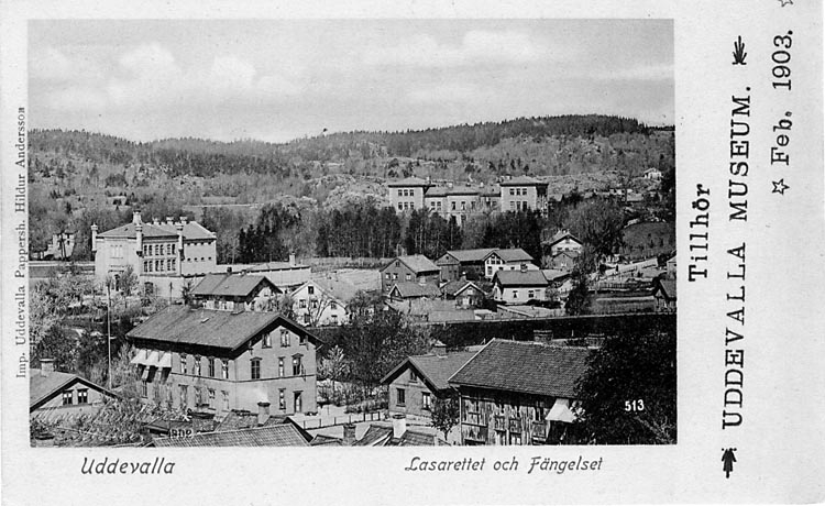 Tryckt text på vykortets framsida: "Uddevalla Lasarettet och Fängelset."