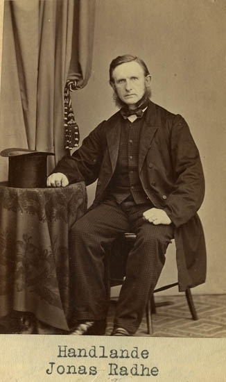 Text på kortets baksida: "Handlaren Jonas Radhe, f. 1822 död 1917".