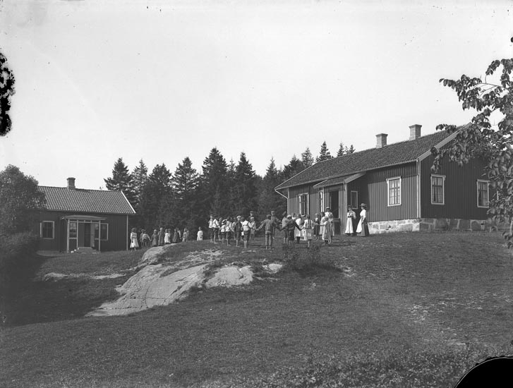 Enligt fotografens noteringar: "Stene skolhus omkring år 1914? eller tidigare. Lärarinnor äro Fröken Elin Thoren Fröken Olsson?"
