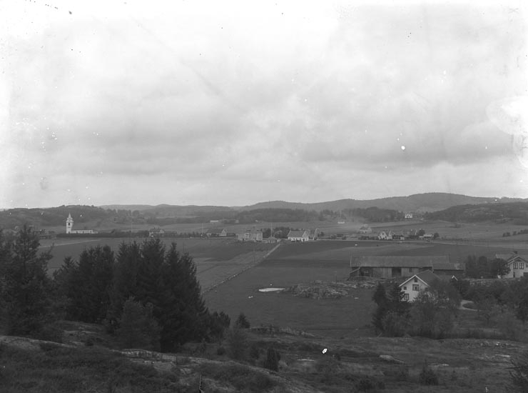 Enligt fotografens noteringar: "Gård på omkring 1919? Gårdar Lycke m.fl. Kyrkan. Mycket gammal plåt."