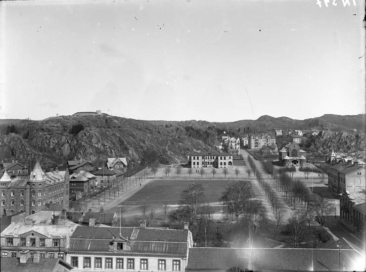 Enligt tidigare noteringar: "Utsikt från Klocktornsberget över Margretegärde och Skolgatan, till höger Margretegärdeskolan och flickskolan."