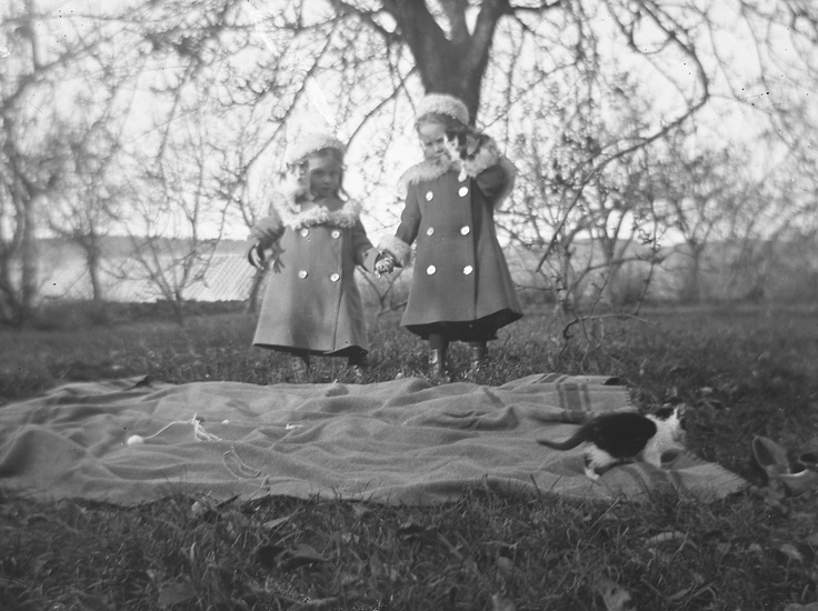 Två flickor med var sin kattunge, samt en kattunge på filten.