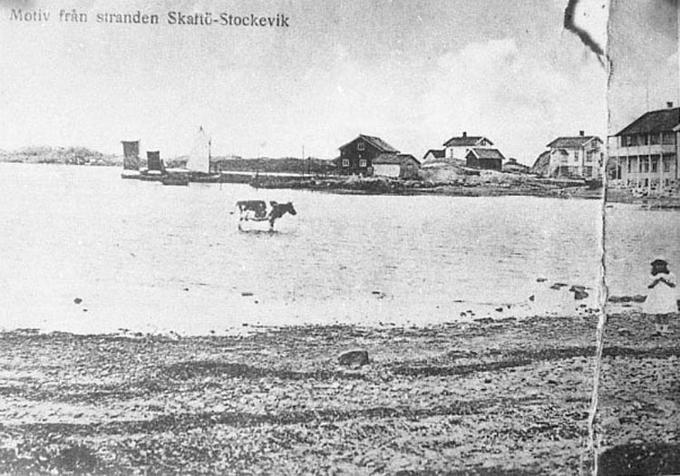 Trykt text på bildens framsida: "Motiv från stranden Skaftö Stockevik".