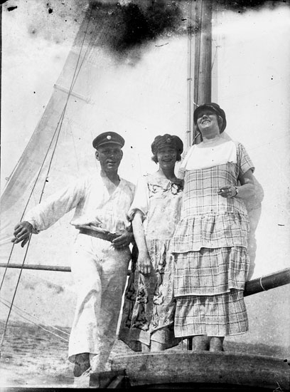 Enl. text i blå bok: "Man och två damer vid mast på en segelbåt."