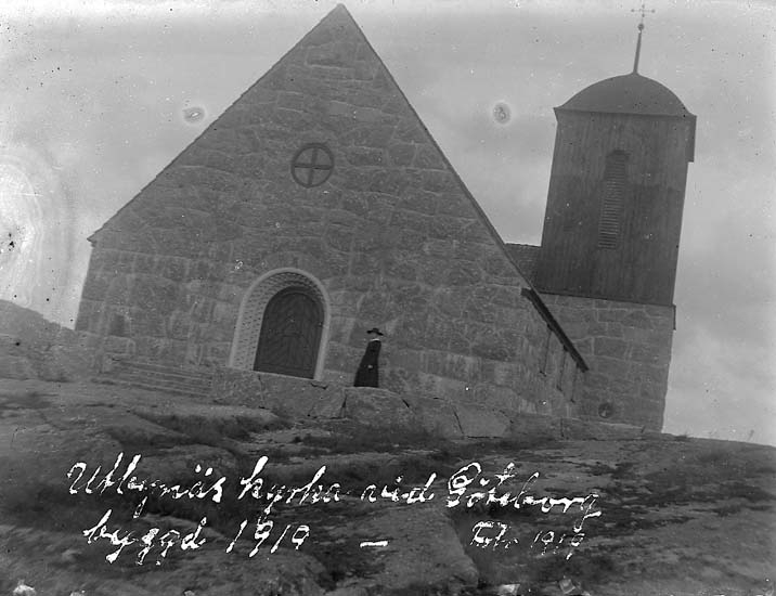 Enligt text på fotot: "Utbynäs kyrka vid Göteborg byggd 1919. Foto 1919".