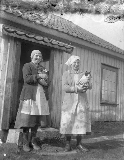 Enligt notering: "Två kvinnor, två katter, ett hus, systrarna Tyra o Klara Karlsson, Råröd ca 1922-23".