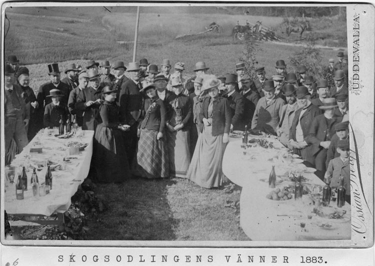 På baksidan skrivet: "Fotografiet taget omkr. år 1883 på Herrestadfjället vid Konsul W. Thorburns jaktstuga "Trollgild" utflykt med Skogsodlingens vänner".