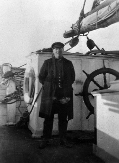 Enl. tidigare notering: "Skeppare Olof Mauritz Carlsson ombord på fraktskonaren "Inga". Repro av foto tillhörande Nils Olof Carlsson, Bohus Malmön".