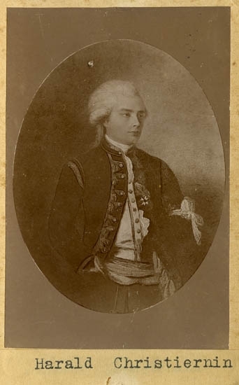 Text på kortets baksida: "Harald Cristiernin, f. 1751 d.1799. 1783 adlad af Christiernin Kontreamiral R.S.O.".