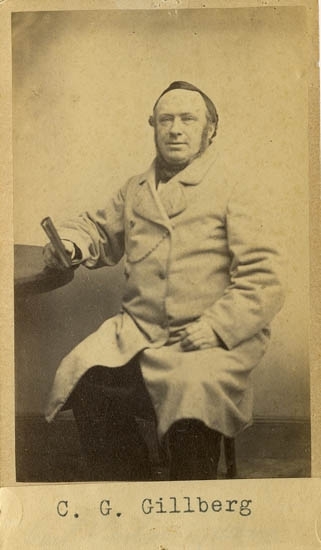 Text på kortets baksida: "Carl Gustaf Gillberg. Har äran önska ett angenämt årskifte. Aftagen 1/12 64. 56 år gammal".