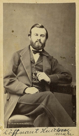 Text på kortets baksida: "Löjtnant Oscar Hultman. Då Herr Kammarskrifvaren varit så god gifva mig ett häfte af Kammarskrifvarens ???positioner, beder jag härmed Herr Kammarskrifvaren emottaga försäkran om min förbindligaste tacksägelse. V-s (?) slott den 12/1 65. Oscar Hultman. Lieutnant vid Kongl. Bohusläns Regemente." "Gift med Berta Kock.".