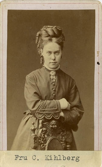 Text på kortets baksida: "Fru Charlotte Kihlberg, f. Andersson. Född 18 april 1853 död 16 nov. 1897. Dotter till Värdshusidkaren Samuel A. och hans hustru Catarina Andersson (Anderssons på Källaren). Gift med postexpeditör Gustaf Kihlberg i U-a. Sedan Postmästare i Bengtsfors o omgift der".