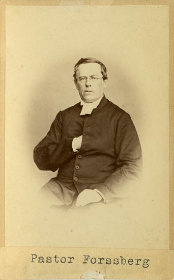 Text på kortets baksida: "Peter Forsberg, f. 1818 d. 1882. Lärare vid Lancasterskolan, Uddevalla. Vid sin död kyrkoherde i Onsala. Vid skolan i U-a 1848 1866".