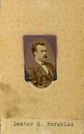 Text på kortets baksida: "Förste Stadsläkaren Doktor Rickhard Forsblad, f. i Gufbäck 2/7 47. SF 1886-95".