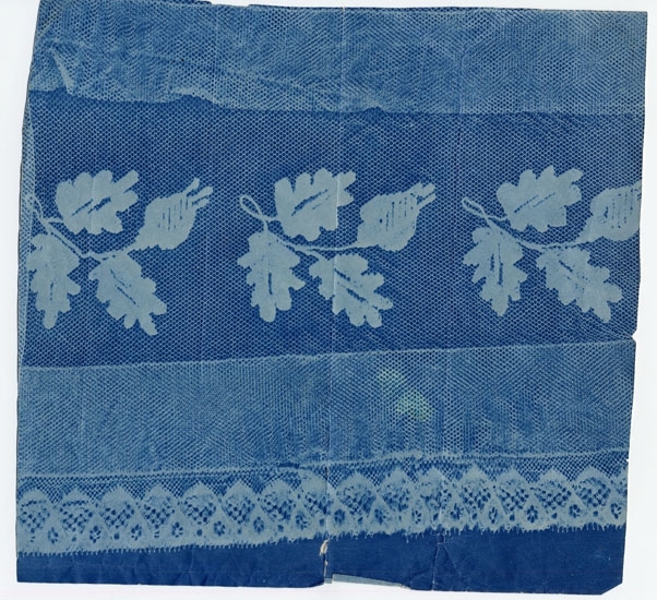 Text på kortets baksida: "Kleberg Askim. Broderiet har form av eklöv mot tyllbotten"