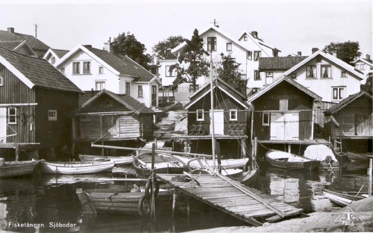 Tryckt text på kortet: "Fisketången. Sjöbodar".