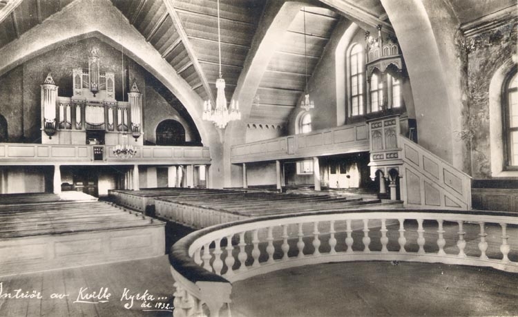 Tryckt text på kortet: "Interiör av Kville Kyrka år 1932".