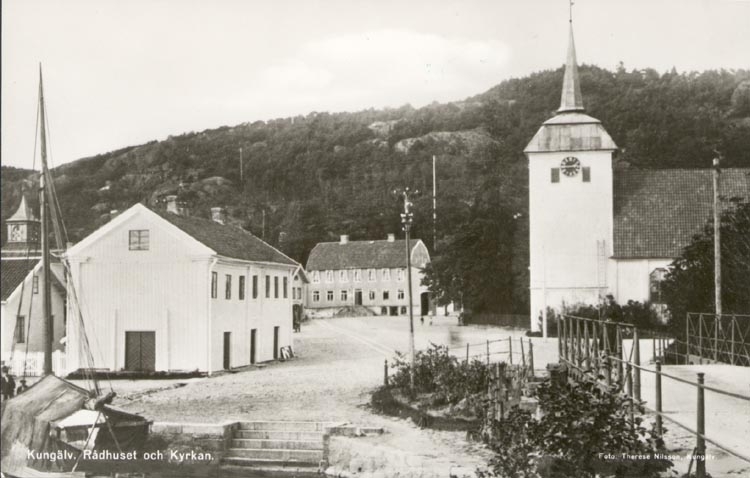 Tryckt text på kortet: "Kungälv. Rådhuset och Kyrkan".