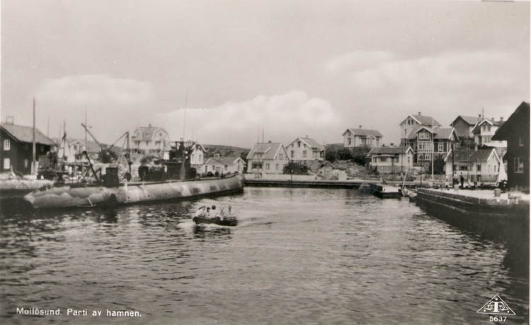 Tryckt text på kortet: "Mollösund. Parti av hamnen"