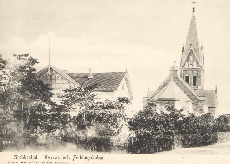 Tryckt text på kortet: "Grebbestad. Kyrkan och Folkhögskolan."