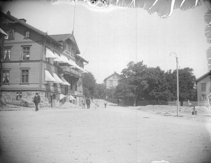 Enligt text som medföljde bilden: "Lysekil. Gjötbergs hotell vid Rosviksgatan tagna från plan vid Carlssons magasin."