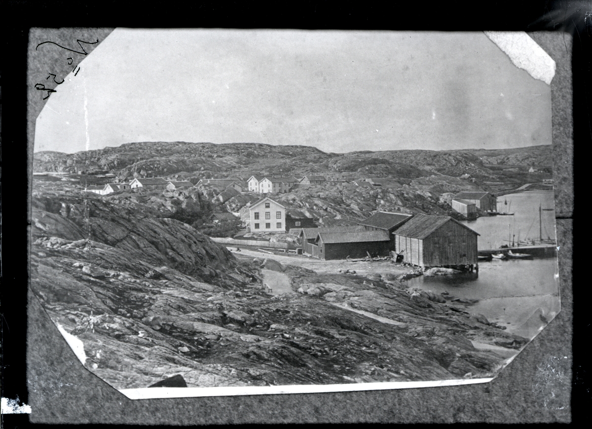 "Tullhuset vid vägen som går från Badhuset. De stora magasinen ligger där som nu fisktorget är omkring 1860 [Lysekil]" enligt text som medföljde bilden.