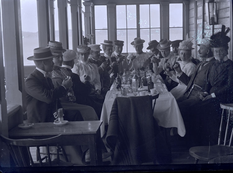 Enligt text som medföljde bilden: "Grupp på restaurantverandan."