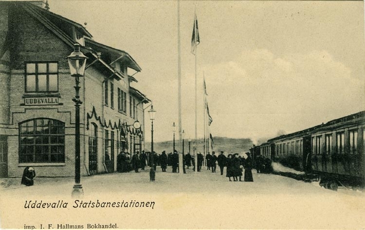 Tryckt text på vykortets baksida: "Uddevalla, Statsbanestationen."