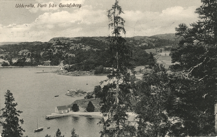 Tryckt text på vykortets framsida: "Uddevalla, Parti från Gustafsberg."