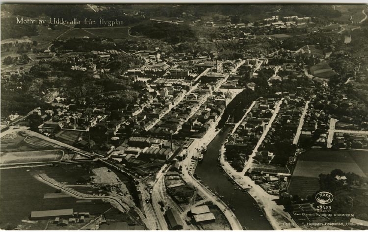 Tryckt text på vykortets framsida: "Motiv av Uddevalla från flygplan."