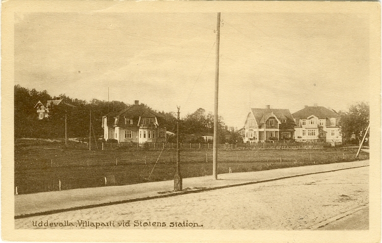 Tryckt text på vykortets framsida: "Uddevalla, Villaparti vid Statens station."