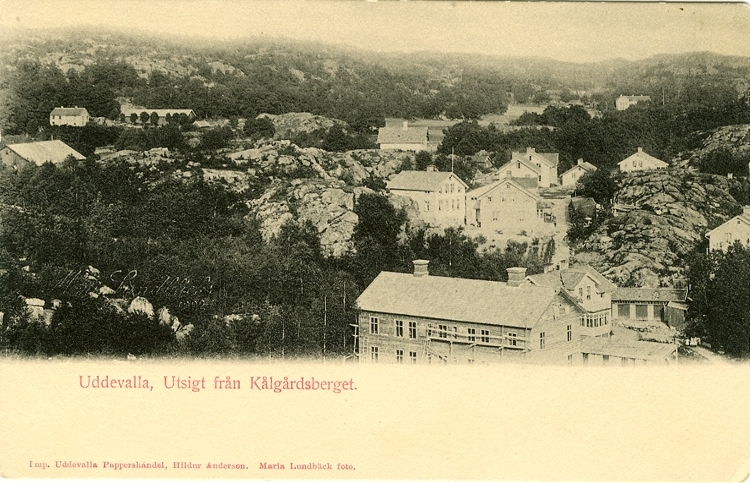 Tryckt text på vykortets framsida: "Uddevalla, Utsigt från Kålgårdsberget."