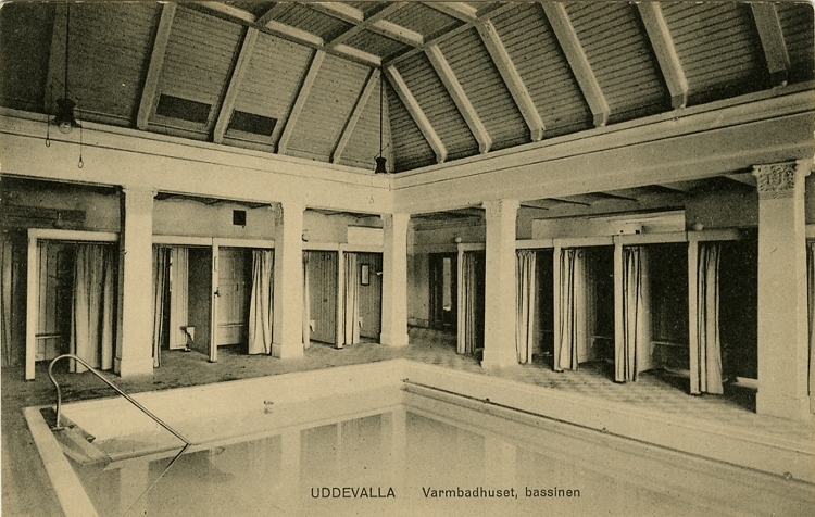 Tryckt text på vykortets framsida: "Uddevalla Varmbadhuset, bassinen."