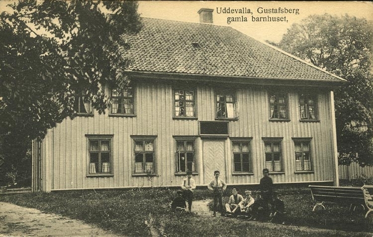 Tryckt text på vykortets framsida: "Uddevalla, Gustafsberg gamla barnhuset."