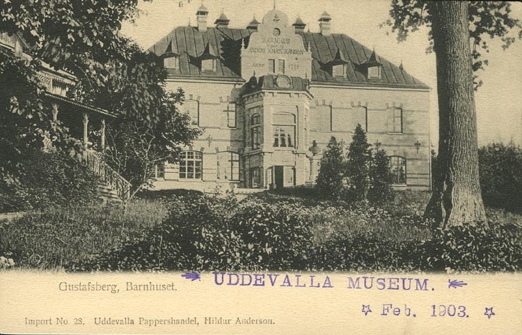 Tryckt text på vykortets framsida: "Gustafsberg, Barnhuset."
