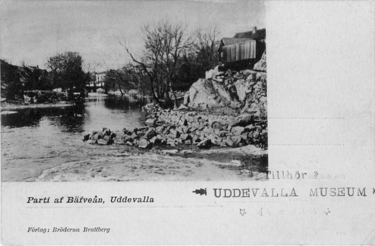 Tryckt text på vykortets framsida: "Parti af Bäfveån, Uddevalla."