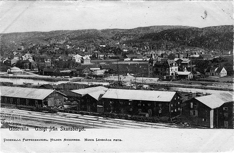 Tryckt text på vykortets framsida: "Uddevalla, Utsigt från Skansberget."