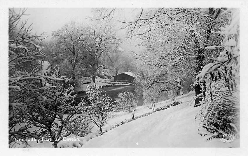Titel: Tryckt text på vykortets framsida: "Uddevalla Parti av Bäveån".