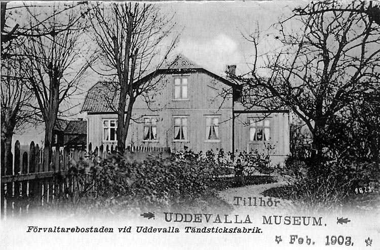 Tryckt text på vykortets framsida: "Förvaltarbostaden vid Uddevalla Tändsticksfabrik."