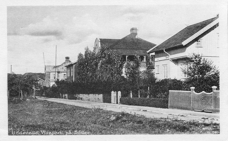 Tryckt text på vykortets framsida: "Uddevalla. Villaparti på söder".