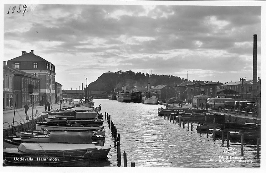 Tryckt text på vykortets framsida: "Uddevalla Hamnmotiv".